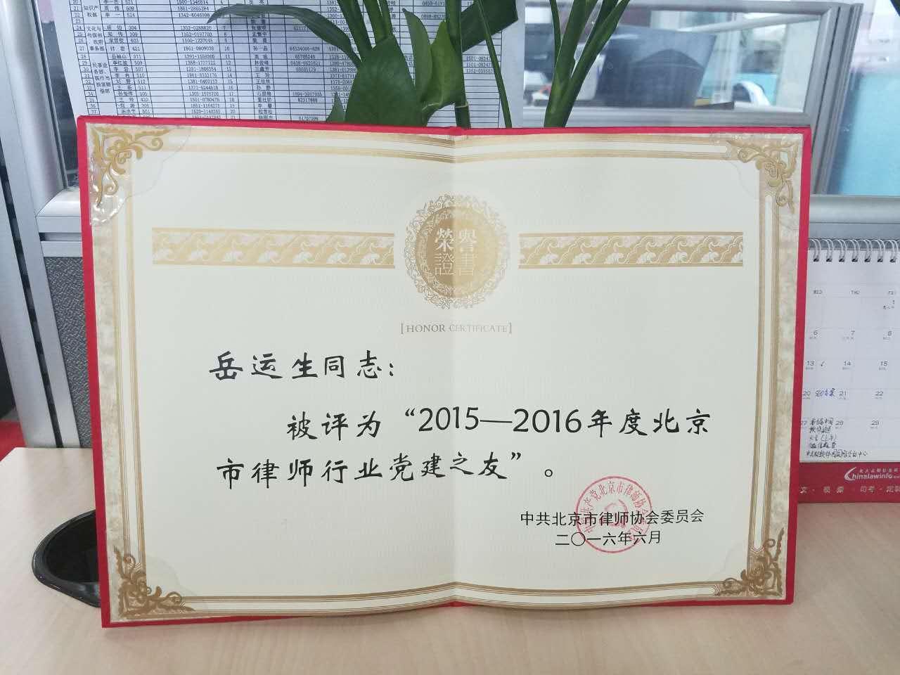 岳运生主任获北京市律师协会表彰