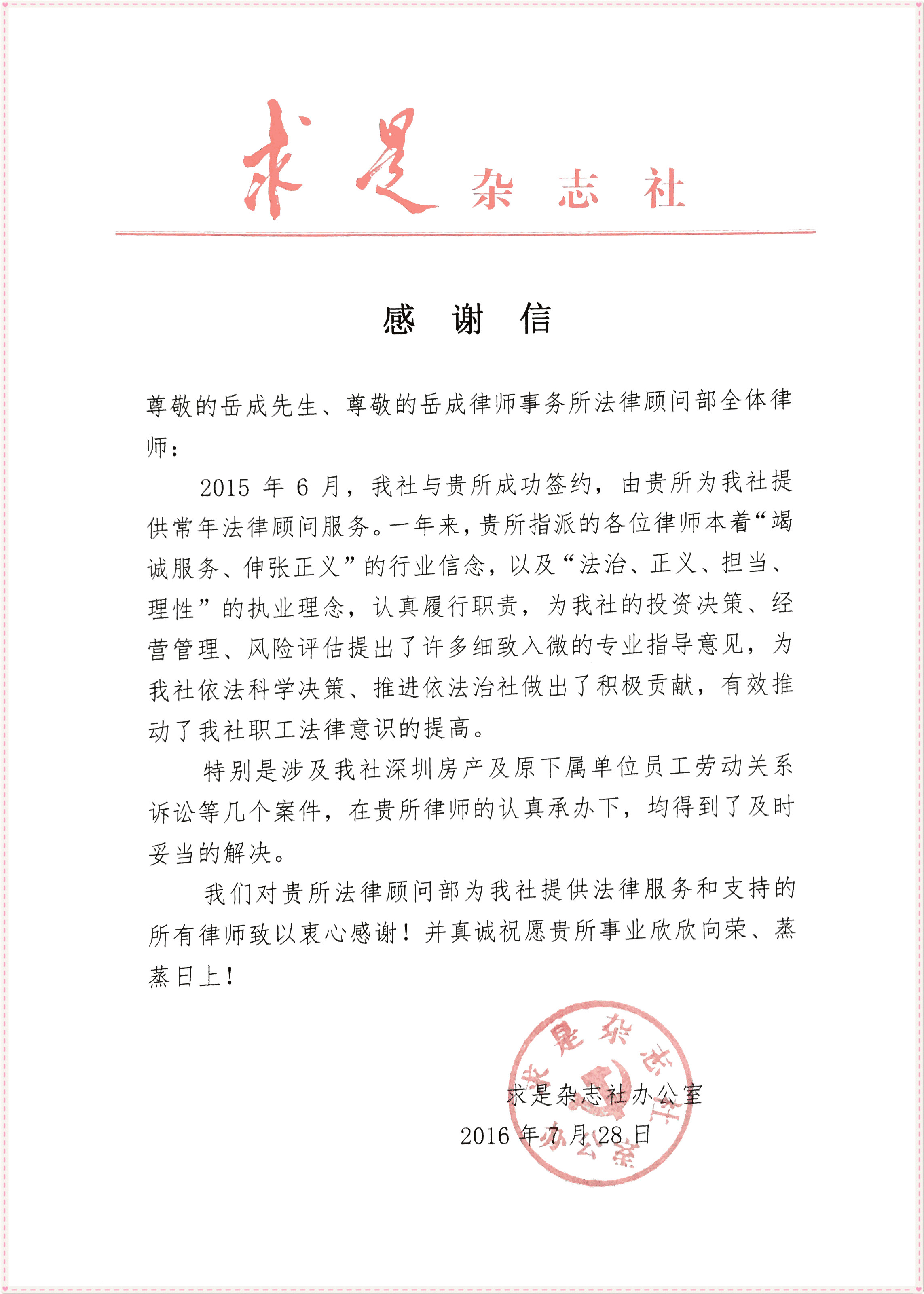 《求是》杂志社致我所感谢信