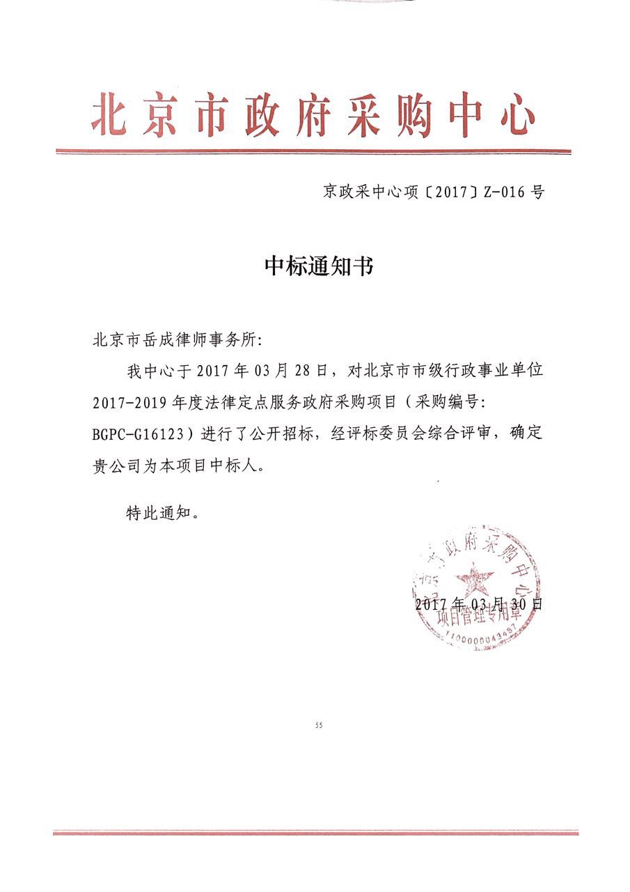 自2014年开始,北京市对市级行政事业单位法律定点服务政府采购项目进行公开招标,继2014年度、2015-2016年度后,岳成所第三次入选,成为北京市市级行政事业单位2017--2019年度法律定点服务单位。