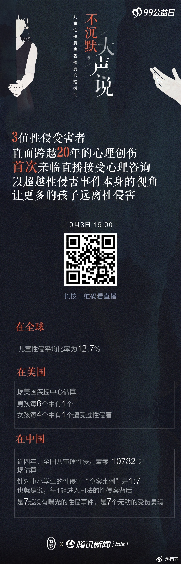 2017年9月3日,北京岳成律师事务所高级合伙人岳屾山律师做客腾讯新闻,参加由腾讯新闻、有养TV共同发起的不沉默,大声说关注儿童性侵公益行动视频直播。