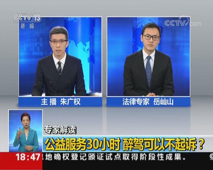 2017年11月29日,北京市岳成律师事务所高级合伙人岳屾山律师作客中央电视台《共同关注》现场直播,解读公益服务30小时 醉驾可以不起诉。