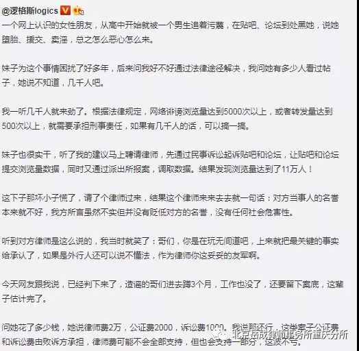 幸好,在这位有丰富法律经验的微博用户逻格斯的指导下,王女士的维权行动逐步步入了正轨。逻格斯说,根据法律规定,应该先起诉网站。比如他在知乎发的帖子,就起诉知乎。所以之前王女士给知乎打了很多电话发了很多函,知乎都说我护用户隐私,拒绝提供。结果一起诉,那边马上就把发帖人的手机号码提供过来了。