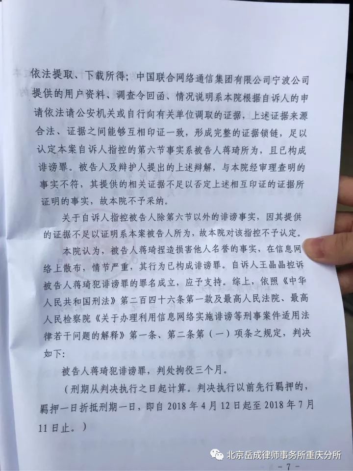 日前,温岭市人民法院对此案的刑事部分宣判,判处被告蒋某三个月拘役。王女士说,由于她只起诉了知乎,没有起诉百度贴吧,所以法院只计算了知乎上的阅读量,这影响了量刑。对此,北京岳成律师事务所高级合伙人岳屾山律师认为,这样看来,法院的量刑比较合适。按照最高法相关司法解释,如果达到5000次阅读,500次转发,那就符合入罪标准。在这个基础上如果没有超出太多,可能就只是轻微的处罚。如果是特别多的阅读特别多的转发,才有可能量刑加重一些。