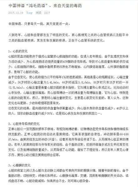 据健康时报报道,由67味中草药配制成的鸿茅药酒,一方面拿到国家食药监部门批的药品批文,申请到国家中药保护品种;另一方面,从明星代言到电视广告植入,不断营造自身的 保健品 形象,在药品和保健品市场左右逢源,销量一路高歌猛进。作为一款甲类非处方药品,无数中老年群体的用药安全问题 长期被忽视。