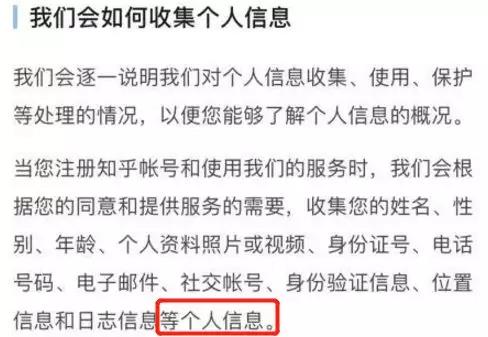 知乎说:收集姓名、性别、年龄、个人资料照片或视频、身份证号、电话号码、电子邮件、社交账号、身份验证信息、位置信息和日志信息等个人信息