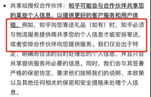 知乎说:例如,知乎向您寄送礼物(如有)时,知乎必须与物流服务提供商共享您的个人信息才能安排寄送,或者安排合作伙伴向您提供服务