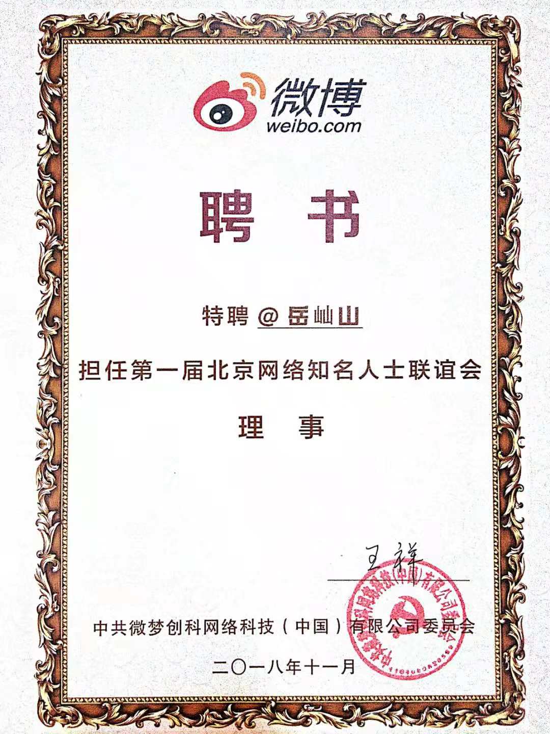 2018年11月,北京岳成律师事务所高级合伙人岳屾山律师受聘担任首届北京网络知名人士联谊会理事。