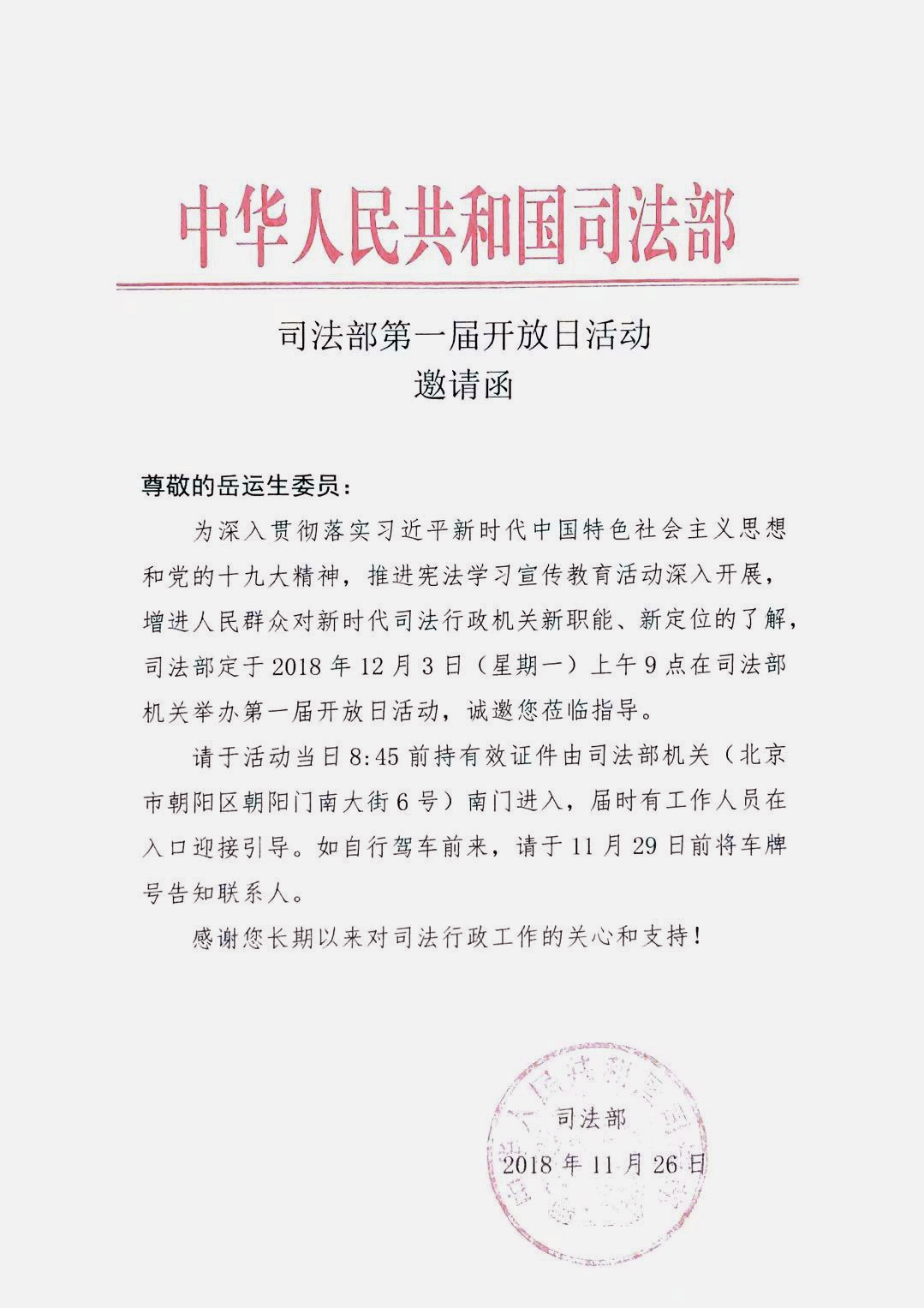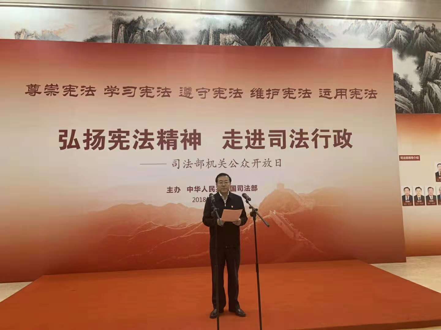 为深入贯彻落实习近平新时代中国特色社会主义思想和党的十九大精神,推进宪法学习宣传教育活动深入开展,增进人民群众对新时代司法行政机关新职能、新定位的了解,2018年12月3日,司法部举办第一届开放日活动。岳运生主任应邀参加了此次活动。