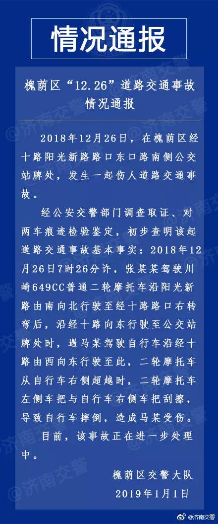 济南交警通报表示,经公安交警部门调查取证,并对事件涉及的摩托车和自行车做了痕迹检验鉴定,初步查明这起道路交通事故基本属实。警方认定:2018年12月26日7点26分左右,张某某驾驶一辆普通二轮摩托车沿阳光新路由南向北行驶到经十路路口右转弯后,然后沿经十路向东行驶到一个公交站牌处的时候,遇马某驾驶自行车沿经十路同一方向行驶。这时,张某某驾驶的摩托车从自行车右侧超越时,摩托车的左侧车把与自行车的右侧车把刮擦,造成了自行车摔倒,老人马某受伤。