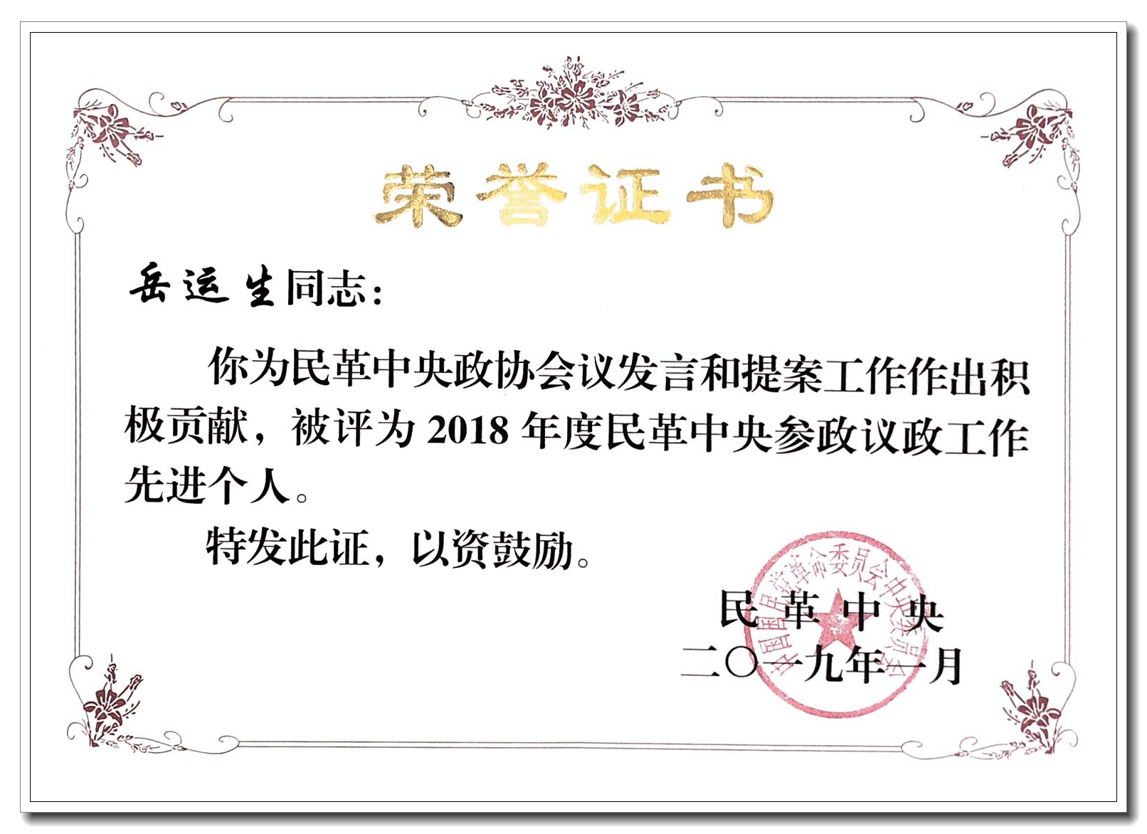 2019年1月,因在民革中央政协会议发言和提案工作中作出积极贡献,北京岳成律师事务所主任岳运生律师被评为2018年度民革中央参政议政工作先进个人。