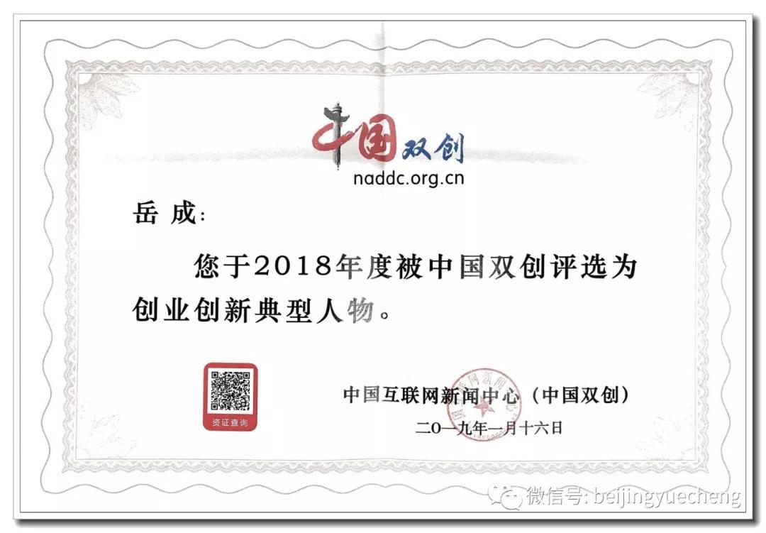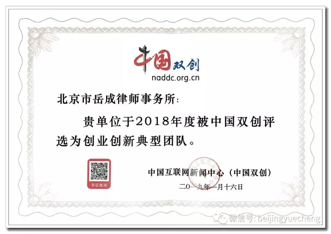 2019年1月16日,北京岳成律师事务所被中国双创评选为创业创新典型团队,首届全国十佳律师、北京岳成律师事务所创始人岳成律师被评选为创业创新典型人物。